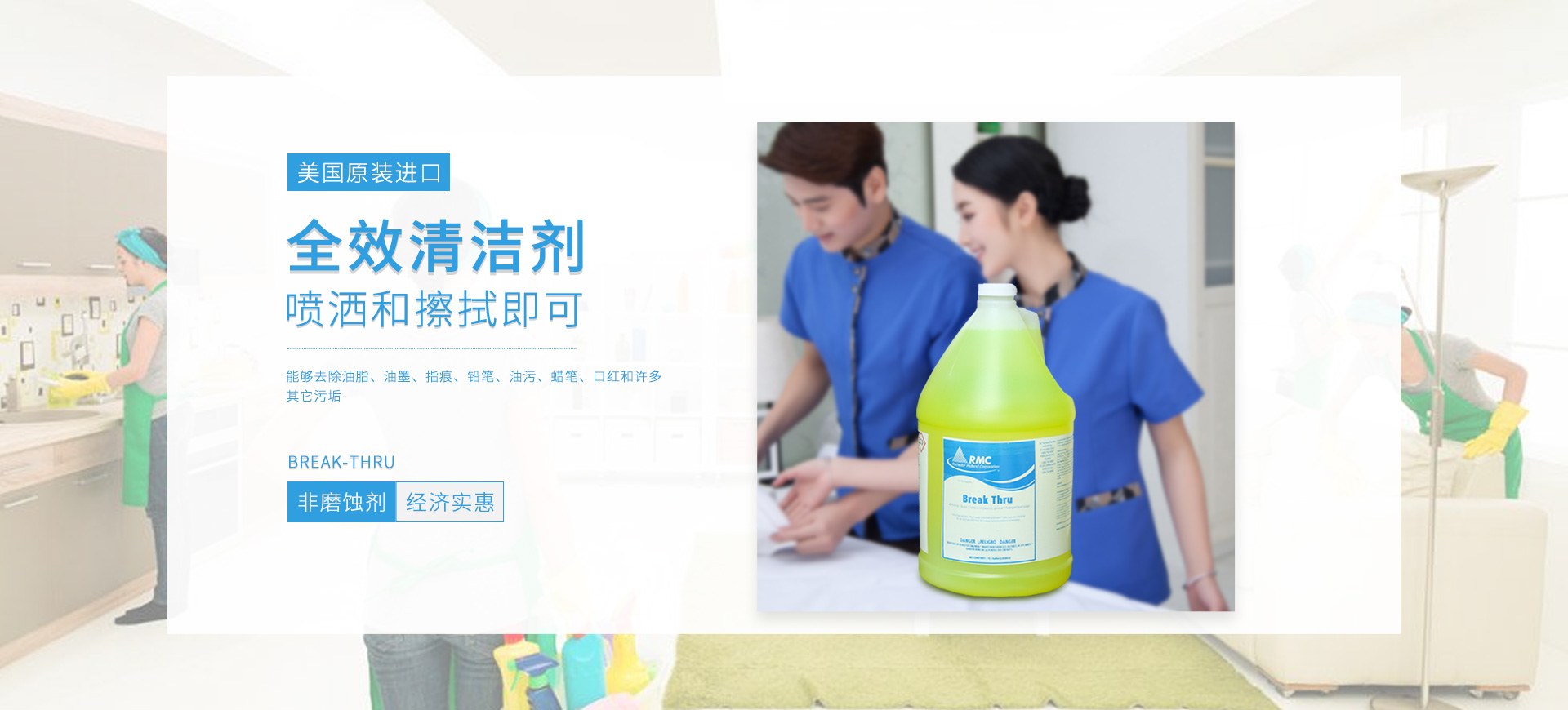 新朗環(huán)境自2015年起與美國具百年歷史的跨國企業(yè)RMC(Rochester Midland Corporation)合作, 進(jìn)口 RMC用于機(jī)械制造、交通運(yùn)輸、航天航空、石油化工、食品禽肉乳制品加工等工業(yè)生產(chǎn)制造行業(yè)的專業(yè)清洗、滅菌系列產(chǎn)品,以及酒店、CBD大廈、學(xué)校(包括幼稚園)、醫(yī)療機(jī)構(gòu)、百貨商場、養(yǎng)殖業(yè)、餐飲業(yè)等商用行業(yè)清潔、消毒系列產(chǎn)品,還有專用于各個行業(yè)單位“廁所革命”的公共衛(wèi)生間根源除味第5代SANOR?衛(wèi)生間自動滴管系統(tǒng)、第6代百屋潔SIOGIENIUS?電子控制衛(wèi)生間自動滴注系統(tǒng)等系列產(chǎn)品項目。